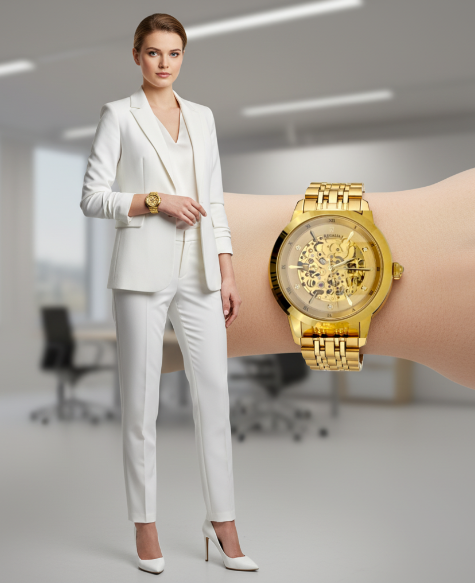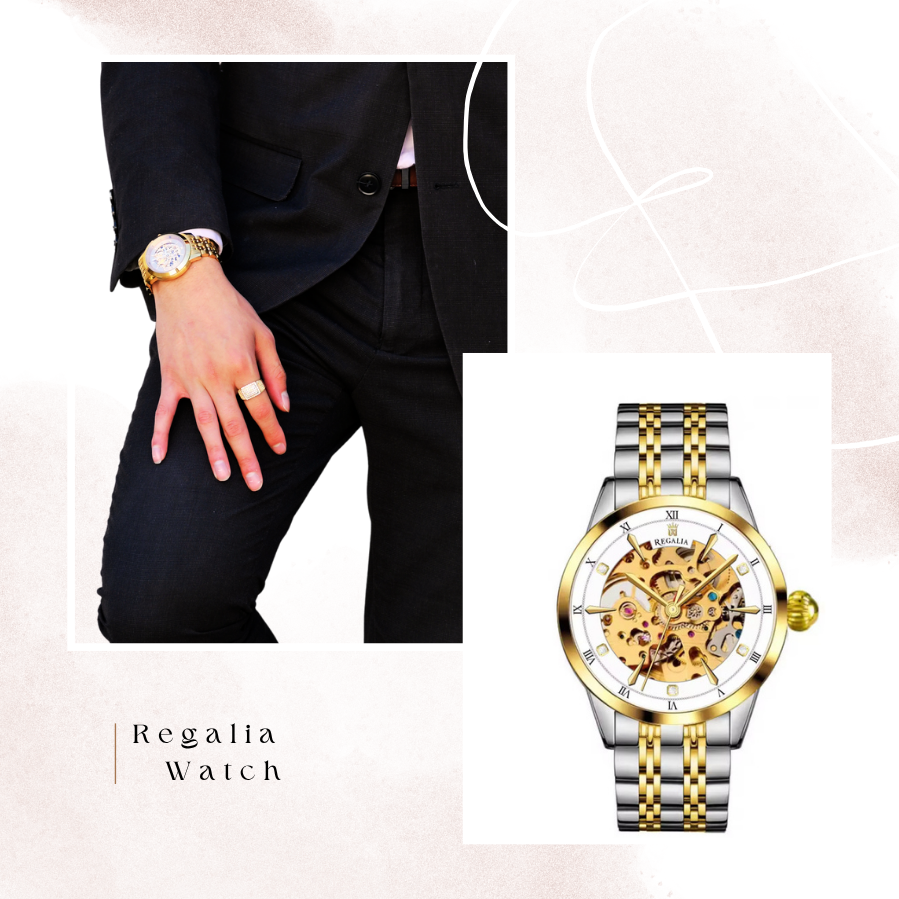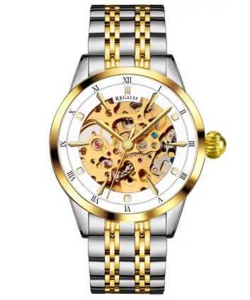 Designed in the United States, the Regalia watch is a masterpiece of engineering and style, designed in the US for those who appreciate the finer details. Its captivating skeleton dial reveals the intricate dance of gears and springs, transforming a simple timepiece into a mesmerizing display of mechanical artistry without compromising the quality