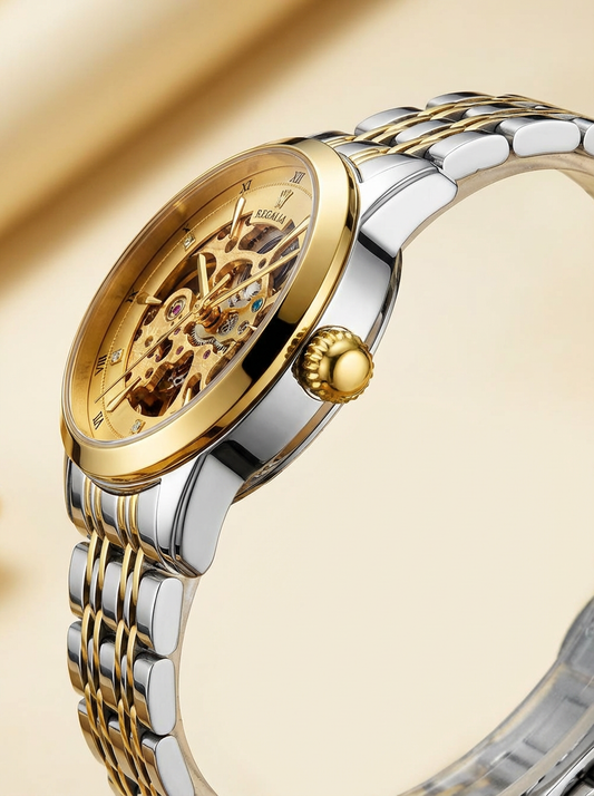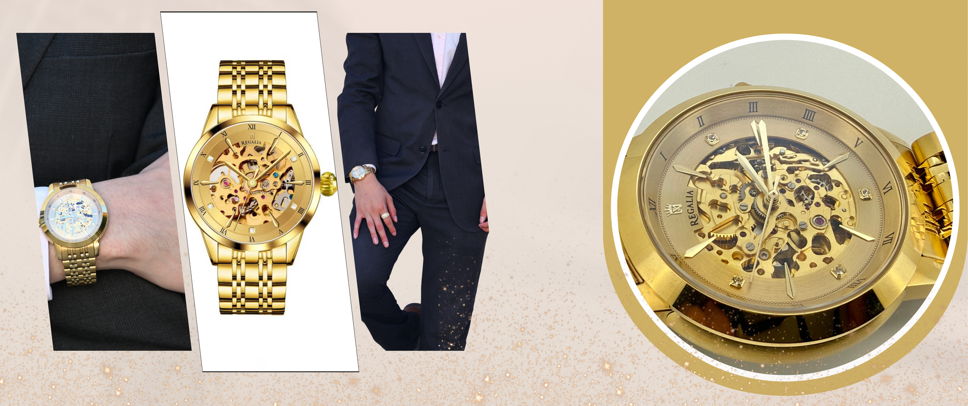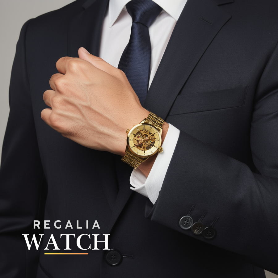Designed in the United States, the Regalia watch is a masterpiece of engineering and style, designed in the US for those who appreciate the finer details. Its captivating skeleton dial reveals the intricate dance of gears and springs, transforming a simple timepiece into a mesmerizing display of mechanical artistry without compromising the quality