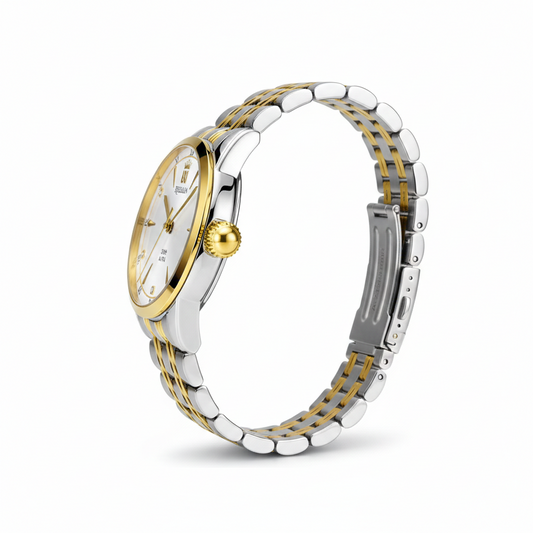 Experience a masterpiece of balanced design and timeless luxury. The Regalia Aura is a pure statement of sophistication, blending the cool strength of stainless steel with the warm brilliance of high-shine gold tones. The radiant white sunray dial serves as a crisp canvas for the gold-tone dauphine hands and a...