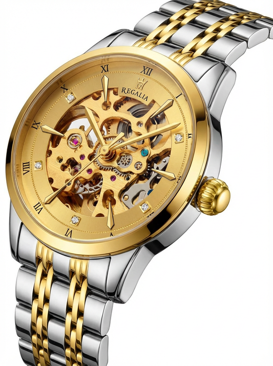 Reveal the Art of Mechanics. The Regalia Gold Skeleton in Two-Tone Silver & Gold is a mesmerizing display of horological engineering designed for the man who appreciates the inner workings of success. The intricate skeletonized dial strips away the ordinary to reveal the beating mechanical heart within, framed by a...
